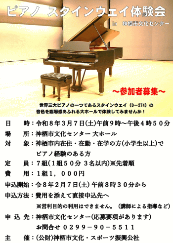 ピアノスタインウェイ体験会 in 神栖市文化センター 日 時:3月7日(土)午前9時 から 午後4時50分 時 間:① 9:00 ~ 9:50 ②10:00~10:50 ③11:00~11:50 ④13:00~13:50 ⑤14:00~14:50 ⑥15:00~15:50 ⑦16:00~16:50 場 所:神栖市文化センター 大ホール 対 象:市内在住・在勤・在学の方(小学生以上) ピアノ経験者 定 員:7組(1組50分 3名以内)先着順 費 用:1,000円 申込開始:2月7日(土) 午前8時30分から 申込方法:費用を添えて直接申込先へ 申込・問合先:神栖市文化センター 0299-90-5511 |